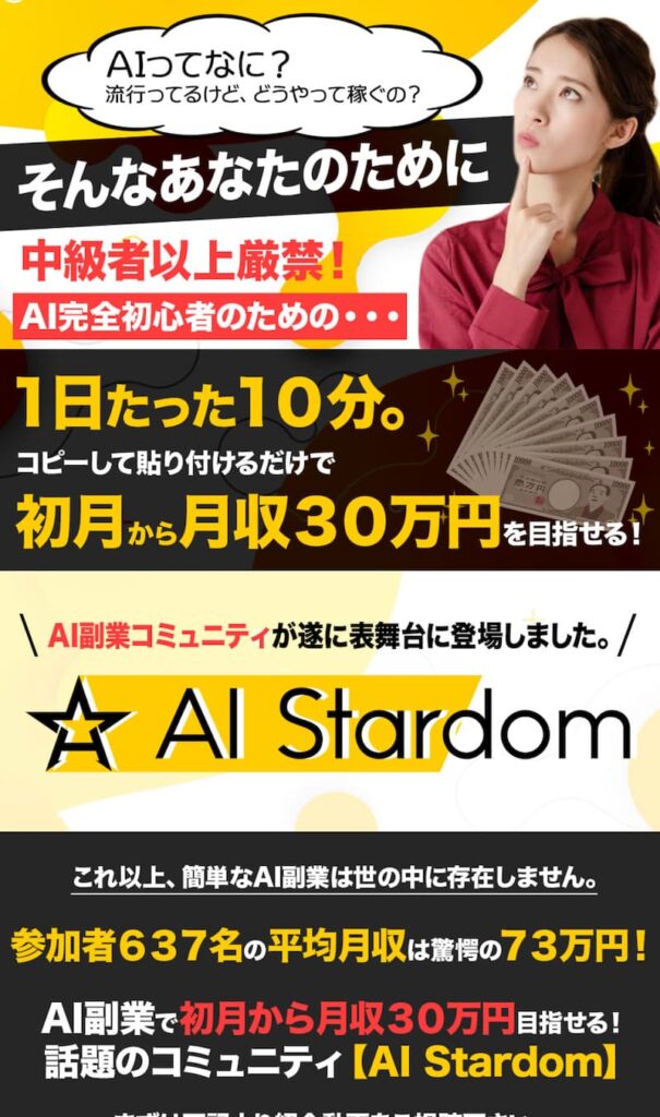 今回は、「AIで稼ぐ副業コミュニティ」を名乗る副業案件『AIスターダム(AI Stardom)』について徹底的に調査します。