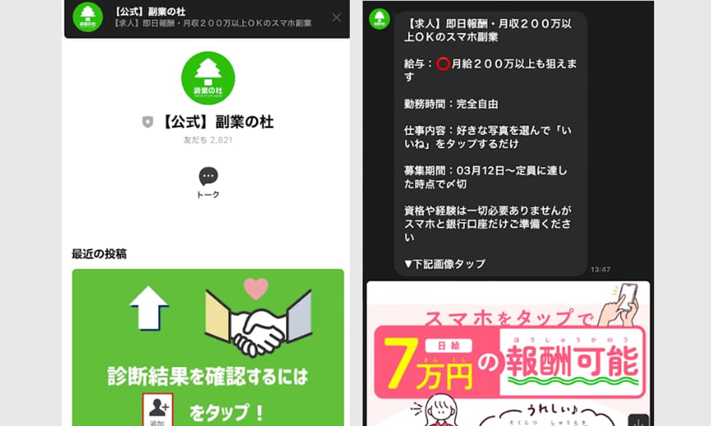 画像を選ぶだけで日給3万円、LINE副業マッチング、カンタンに誰でも稼げる、など
