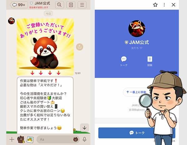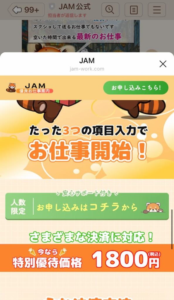 案件ページの「お申し込みはこちら」というボタンをタップすると、「JAM公式」というLINEアカウントを追加することになりました。
