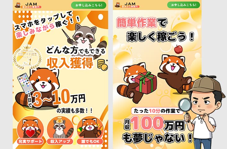 JAM副業は、スマホ操作による作業とのことで、アフィリエイトやリファラル報酬を活用して利益を得る仕組みとも考えられますが、1日で3〜10万円の実績・月収100万円など収益が保証されるかのような宣伝は怪しいですよね。