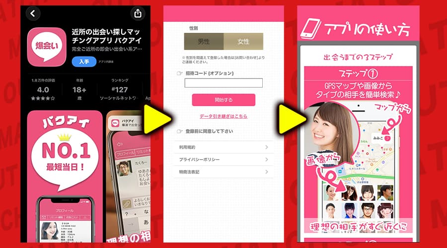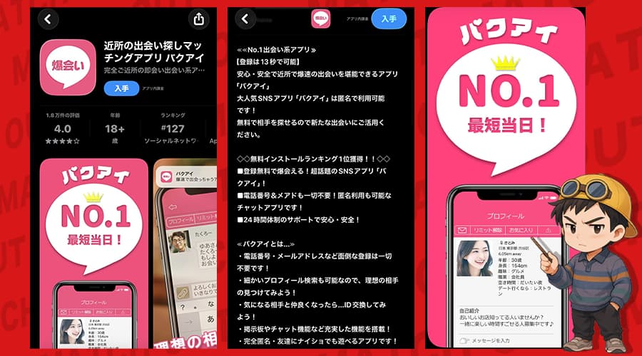 じゃあここからは、俺が実際にバクアイ(爆会い)をインストールして登録検証していくぞ。