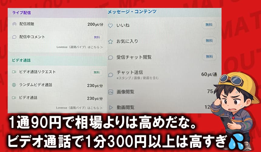 月額制でメッセージ送り放題のマッチングアプリと比べると、コスパはかなり悪いんだよね。