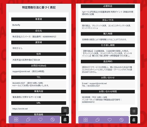 特定商取引法の表記や異性紹介事業の届け出は確認できましたが、電気通信事業の届け出が見当たらず、利用規約にも運営側が責任を負わない内容が含まれています。高額課金が発生しやすい仕組みである以上、金銭トラブルのリスクがある点は十分に注意すべきです。