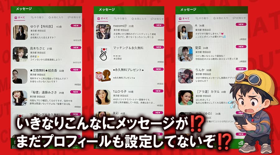 登録してすぐ大量メッセ来た時点で違和感あったんですが、やっぱりそうですよね…。先にこの記事読めて助かりました。