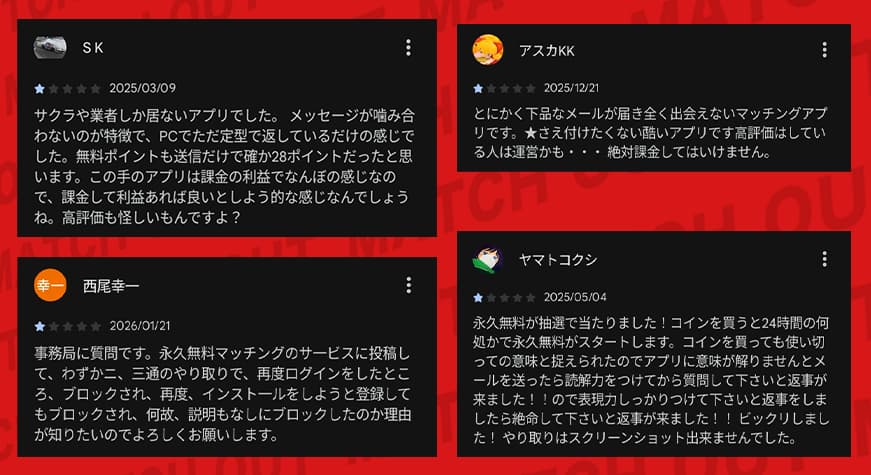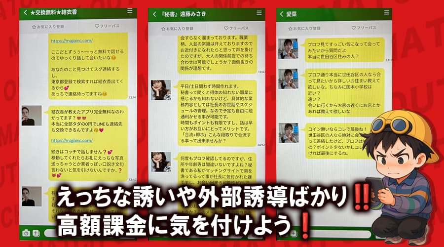 特に「登録直後に一斉に来る誘惑メッセージ」は、サクラや自動送信を疑う人が多かったな。