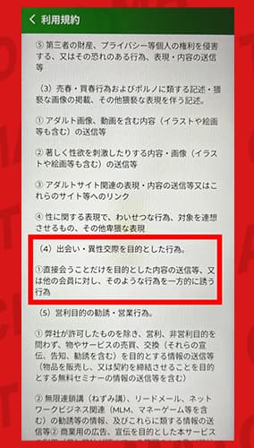 紹介ページでは出会いを匂わせているのに、規約では禁止。