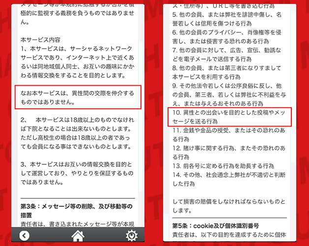 だけど…利用規約を確認すると「出会い・交際を目的とした利用は禁止」とはっきり書かれているんだ。