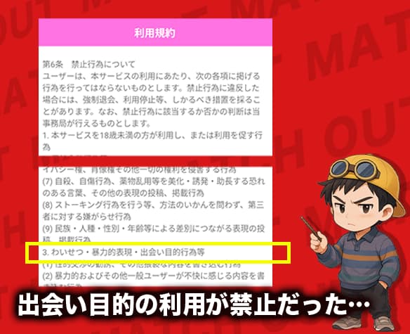 - 規約に「出会い・異性交際目的の行為が禁止」とあり内容が矛盾