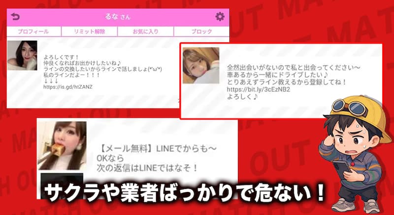 例えば、ロマンス詐欺っぽく距離を詰めてきたり、美人局みたいに会う場所を指定してきたり、別のサイトやLINEに誘導してくるケースな。