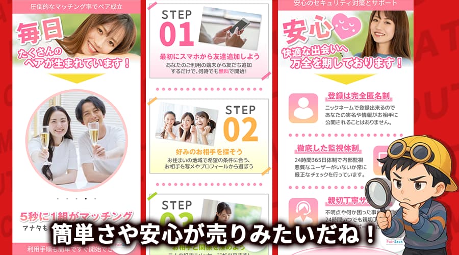 PairSeat(ペアシート)は、一見すると「毎日ペアが生まれている」「簡単3STEP」など、かなり期待を持たせる作りになっている。