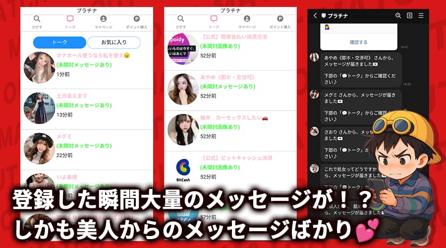後輩YくんプラチナってLINE追加したら、いきなり女性から大量にメッセージが来ました…。本当に出会えるんでしょうか?課金も高くて不安です。