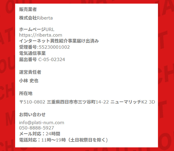 もちろん、プラチナには特定商取引法の表記や、異性紹介事業・電気通信事業の届出番号が掲載されている。