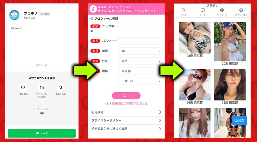 プラチナは、LINEを使って登録し、そのまま外部の出会い系サイトでやり取りを行うタイプの恋活サービスだ。