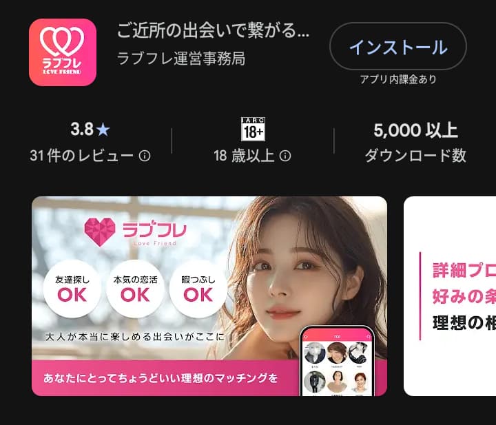 ラブフレは「ご近所の出会いで繋がる」「恋人・結婚相手・友達探しまで対応」といった、かなり幅広い出会いをうたっているアプリだな。