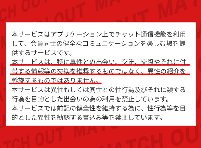 しかも、利用規約を読んでいくと「そもそも出会い目的が禁止」って書いてあってさ…それ、出会い系として致命的じゃないか⁉️って思ったぞ。