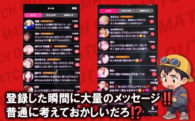 - 登録直後からサクラやチャットレディと疑われるアカウントから大量メッセージが届く