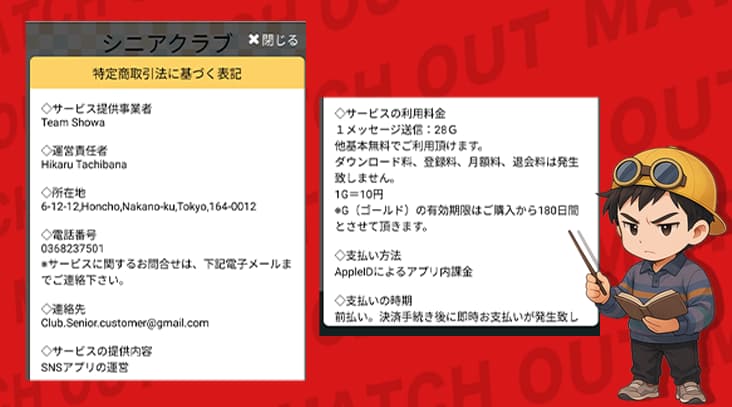 ってことで俺も、シニアクラブの特定商取引法の表記や運営情報、それっぽい規約まわりをチェックしてみたぞ。