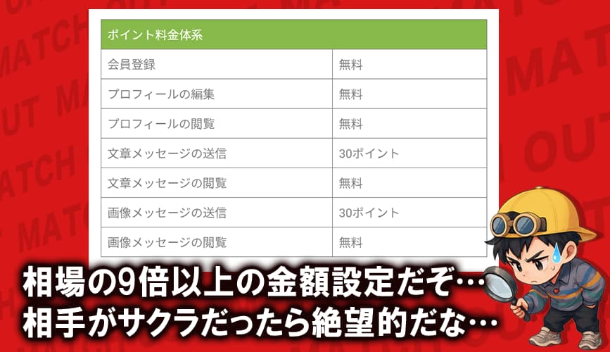 この料金設定で、もし相手が実在しない、もしくはサクラだった場合、金銭的な被害につながるリスクがありますので、十分な注意が必要です。