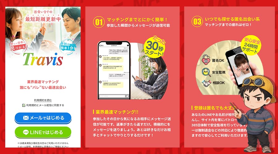 紹介ページを見る限り、「すぐにマッチングできる」「登録後すぐメッセージ可能」「匿名で利用できる」といった、かなりハードルが低そうな内容が並んでたな。