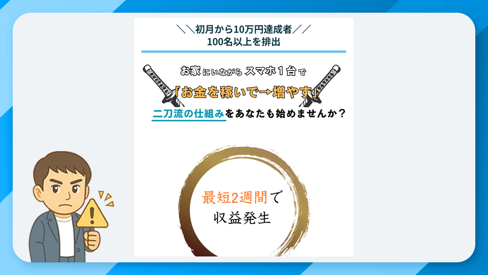 - 理由2:「最短2週間で初収益」「初月10万円」など、再現性のない誇大な成果を強調している